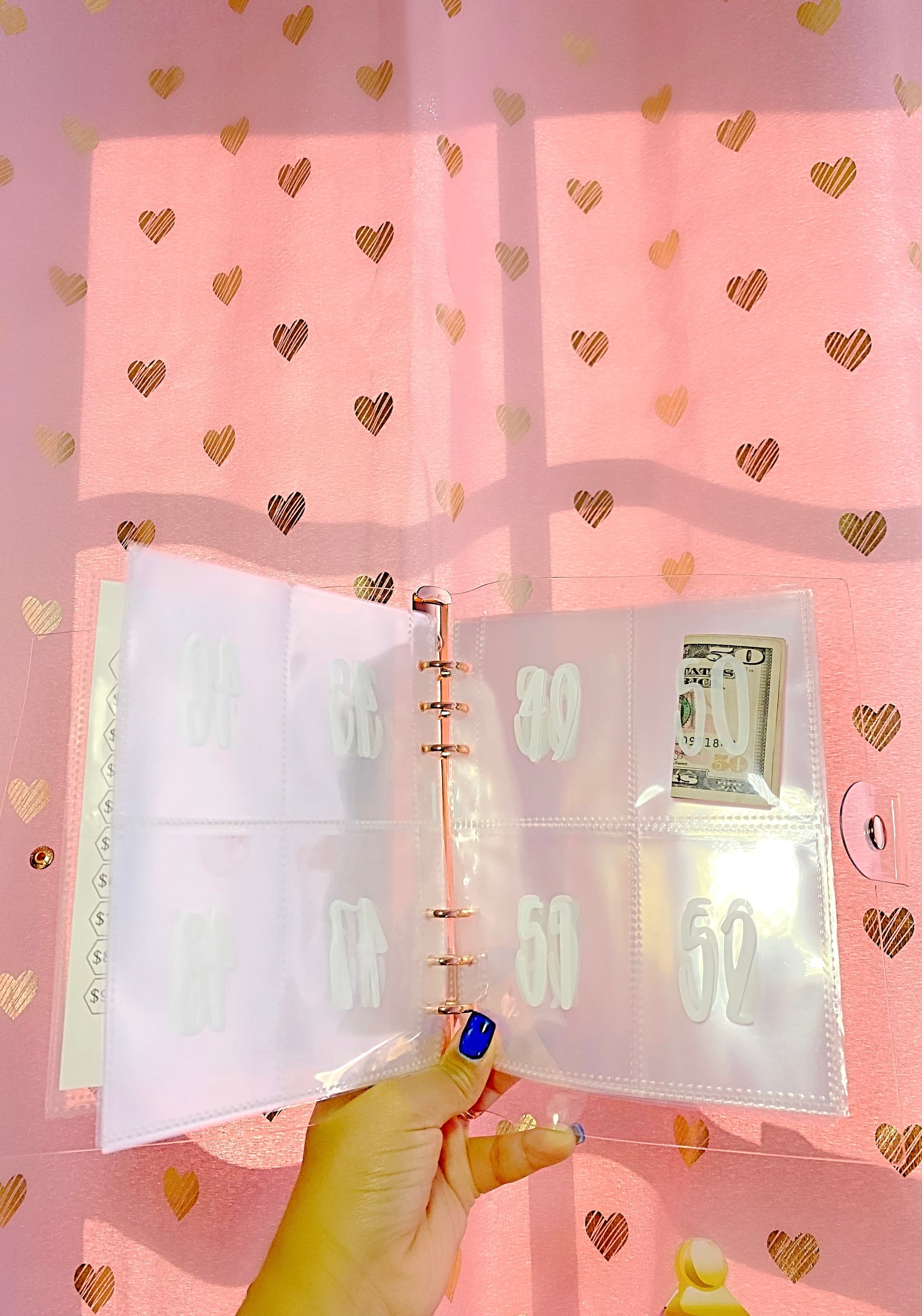 Challenge binder with laminated tracking paper and pre-numbered pockets.